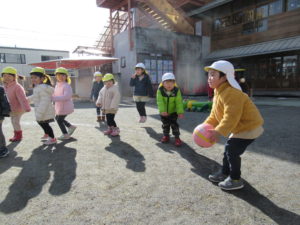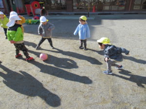 そして、「こどもは風の子♪」 お外で転がしドッヂをして、いっぱい遊んだよ。