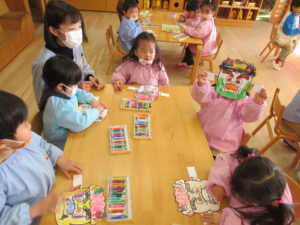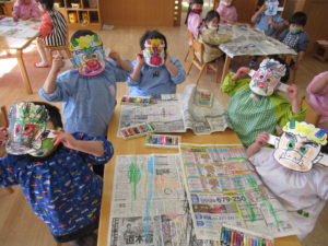 「がおーっ」カラフルおにさん大集合!ぼく・わたしのおに、こわいでしょ!?先生や友達とお話ししながら楽しいお面づくりをしましたよ。