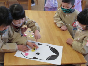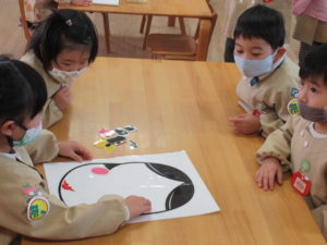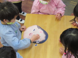 年中組のみんなも、「ふくわらい」であそんだよ。目をしっかりつむって・・・できあがった顔を見て、みんなで大笑いでした。
