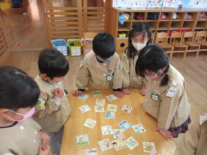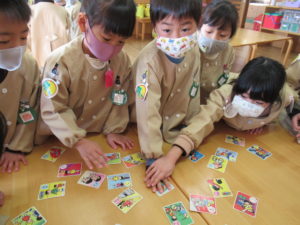 「かるた、やりたい!」はじめは慣れない様子でしたが、慣れてくると、すばやく見つけて「あった!」・・・やっぱりお友達と遊ぶのはすごく楽しいね。