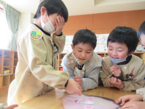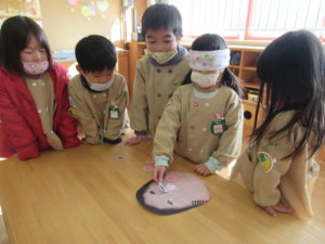「ふくわらい」で遊んだよ!「これ、なあに?どこ?」「ここだよ、ここだよ♪」