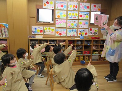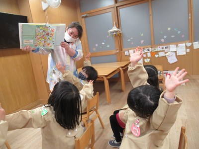🌸たんぽぽ組🌸絵本がだいすきな子ども達とさやか先生。春にピッタリの仕掛け絵本『おとどけものでーす』。春を待つかおりちゃんにところへ届けられた箱には、なにがはいっていたのかな? 絵本いっぱいに描かれたちょうちょを夢中で捕まえるこどもたちでした。