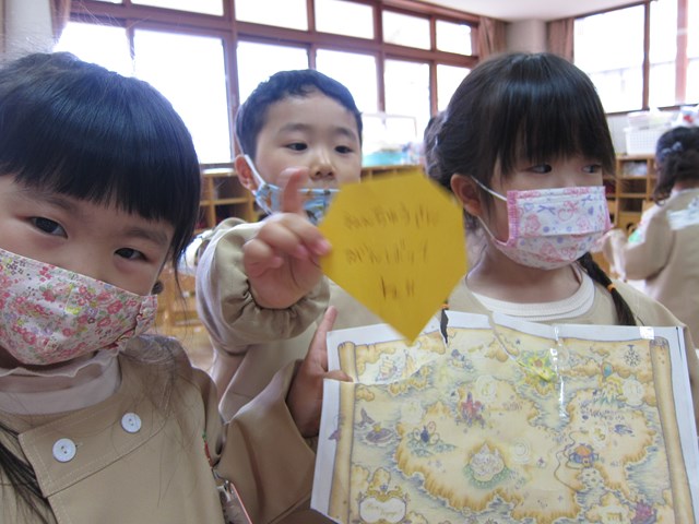 新聞紙を1枚持って、宝の地図をたよりに、お部屋の中を探検しました。くねくねロードやぴょんぴょんロードを通ってみたり、新聞紙を広げて布団のように寝転がったり、びりびり破いてそうめんを作って食べたり・・・最後は宝を見つけて「やった~!」その宝石の裏には「ねんちゅうぐみさん、がんばってね!」のメッセージが。わくわくどきどきの宝探しとなりました。