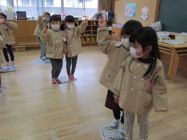 すずらん組さんは、ジャンケンがだ~いすき♡みんなで新聞ジャンケンをしました。大好きなお友達と一緒に新聞に乗り、「やった!勝った!」「落ちちゃうよ~」「つかまって!」ととっても楽しそうでした。
