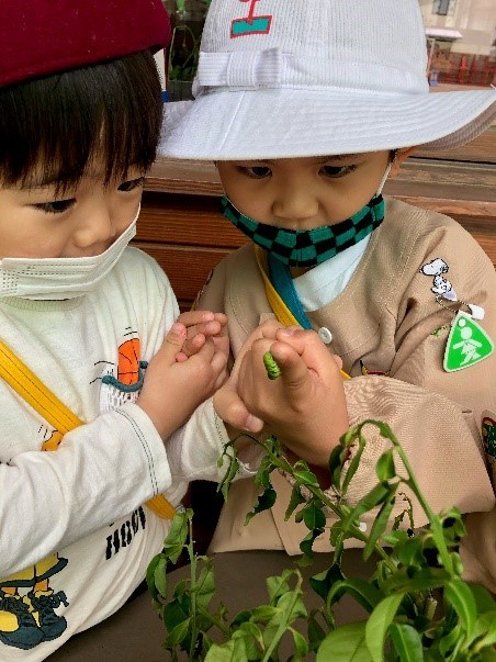 年少さんに「これ、卵だよ。ここから幼虫が産まれるんだよ」と年長さんが教えてあげたり、捕まえてあげたり。この時期の子ども同士の触れ合いのきっかけにもなります。