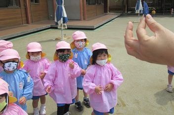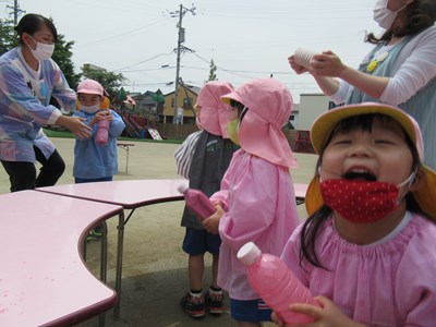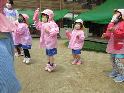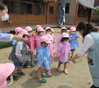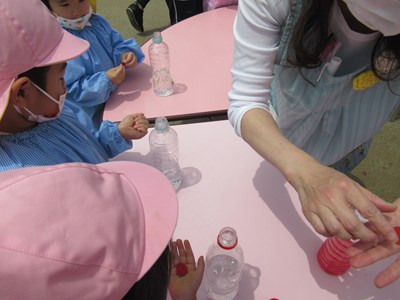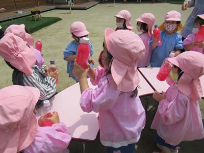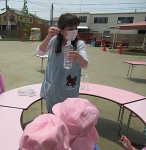 子ども達は、お母さん達が持たせて下さった『水の入ったペットボトル』を持って、かずこ先生の周りに集まりました。