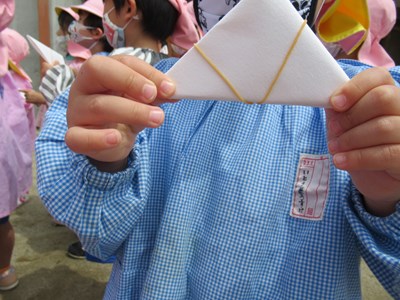そこで、四角や三角に折りたたんだ和紙をもらった子ども達。「おにぎりみたいな、三角だね」「ぼくは、四角だよ!」