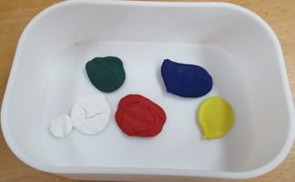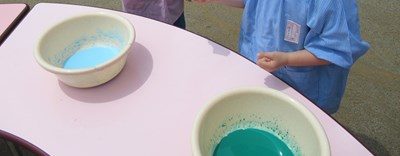 「さあ、この青色のたねを、水の入った入れ物(桶)に入れてみるよ。よ~く見ていてね。」子ども達は、何が始まるんだろう??と、じっと見入っていましたよ。