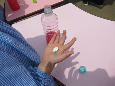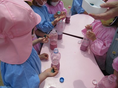 「あれ?こ~んな色に変身したよ!!」・・・思わぬ色に変わった、ペットボトルの色水を不思議そうに覗き込んでいましたよ。