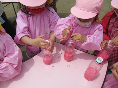 「先生、赤くなったよ!!」ふりふりダンスに夢中だったみんなは、ペットボトルをみてびっくり。