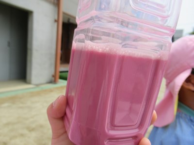 「うわ~!ぶどうジュースみたいになったよ!」「これ、むらさき色だよ」と話している子も。