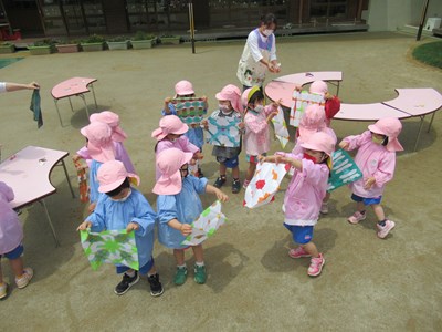 そこで、かずこ先生が「みんなの三角や四角の紙、どうなったかな?乾いたか見てこようよ!」