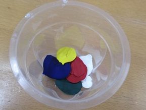 できあがったら、ゴムを外さずに、ベランダに敷いた新聞紙の上に置いて乾かします。どうなったか気になって、輪ゴムを取ってみたいけれど、がまんがまん。