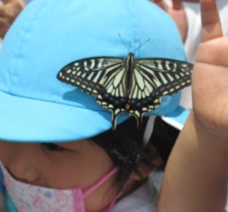 なんと、ゆいこちゃんのカラー帽子にとまりました!そして、まるで「みんな、私の羽をみて!」と言わんばかりに、美しい模様の羽をいっぱいに広げてじっとしていました。
