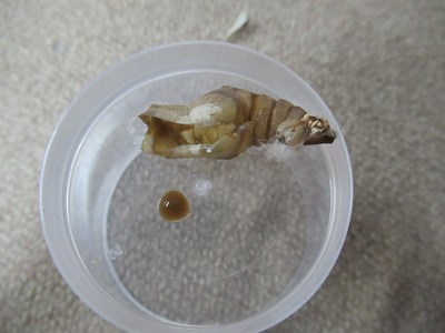 「この殻の下の方に溜まっているのって、ふしぎ発見タイムで園長先生が『サナギの中で 幼虫の身体は一旦液体になる』って言われた、その液体なのかな?」
