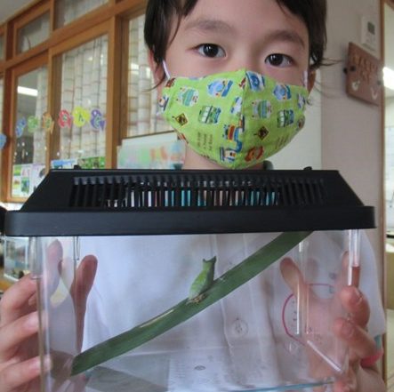 5月18日、つばき組のたっくんが、おばあちゃんのお庭で見つけたアゲハチョウのサナギをクラスに持ってきてくれました。大きな大きなサナギに、みんなは大喜びです。