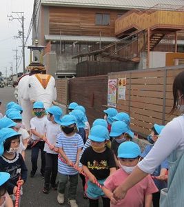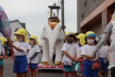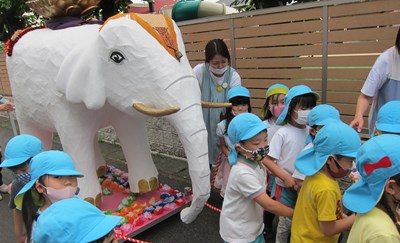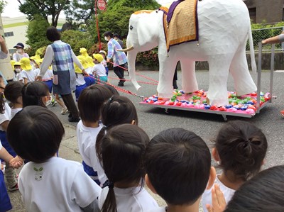 年長組は5月24日(月)、年中組は5月26日(水)に、お釈迦様を乗せた白い象と一緒に園周辺をパレードしました。年少組とちゅうりっぷ組のみんなは、応援しながら見学しましたよ。