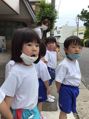 玄関の前で、「まだかな?まだかな?」と首を長くして待っていた年少組のみんな。