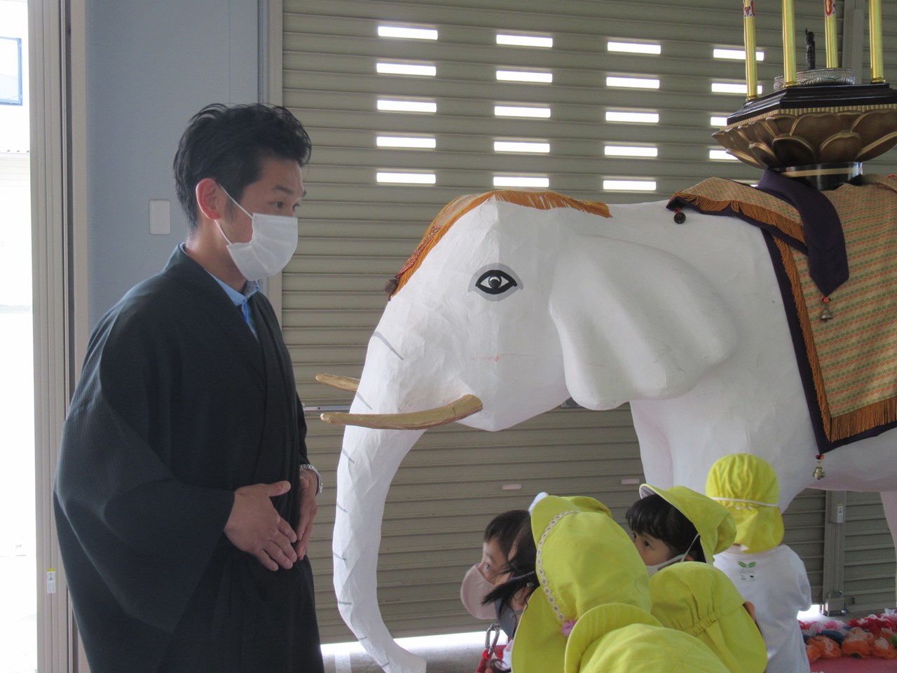 天を指さすお釈迦様も、象の背に揺られながら、若葉第三幼稚園の園庭の景色を眺めてみえるようですね。