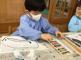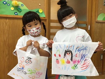 おさかなの形の真っ白い手提げバッグ。(教務課の先生達の手作りバッグです😊)そこに、布描きクレヨンを使って思い思いにお絵かきをしました。
