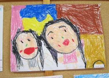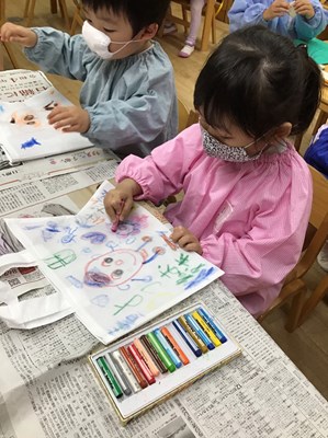 「ママを描いた!」「みんなでキャンプしてるよ」とどの子もにこにこしながらお絵かきしている様子。