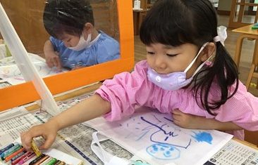 自由画帳に描いた絵よりもなんだか生き生きとした楽しそうなバッグが完成♪ とても気に入って「早く持って帰りたい!」とおさかなバッグを腕にかけて持ち歩く姿もありましたよ。ステキなプレゼントが完成しました。