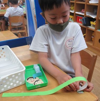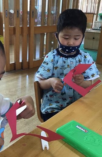 ハサミを持つ時にこんなかわいい会話がありました。それぞれの穴に入れる指をかぞくに見立てながら「小さいおうちはおとうさん、大きいおうちはお母さんと子ども達だね!」