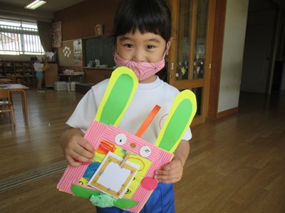 ハサミをたくさん使って、うさぎのメモホルダーを作った年中組のみんな。少し苦手な子もいましたが、かぞくのことを思いながら頑張って最後まで自分で作りきった子ども達。
