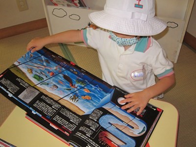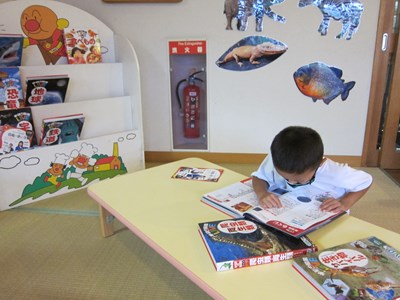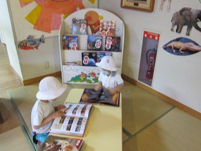 幼稚園にいろいろな図鑑が仲間入りしたので、みんなが興味のある図鑑をじっくり読む場所なんです。