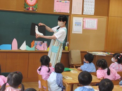 7月7日(水)、前回、わたがしを作ってくれた、おさとう先生がまた遊びに来てくれました。おさとう先生は最初に、段がついていたり、細長かったり、お家の形だったり・・・様々な色画用紙をみせてくれました。