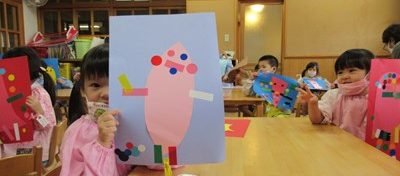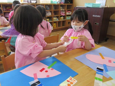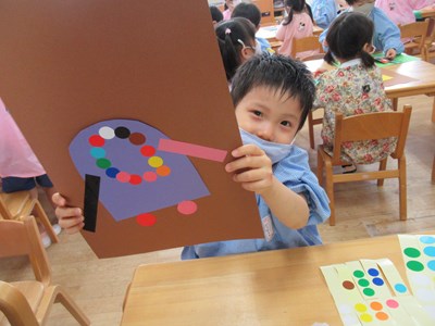 今回のアートタイムでは、小さな指先をいっぱい使いながら、「シールを貼って、イメージを形にしていくこと」を無理なく楽しく取り組むことが出来た子どもたち。