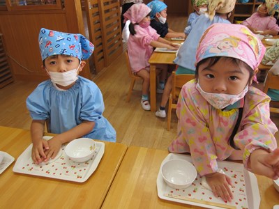 ご飯を潰して平らにするのはなかなか力が要ったね。少しずつ慣れてきたみたい♪