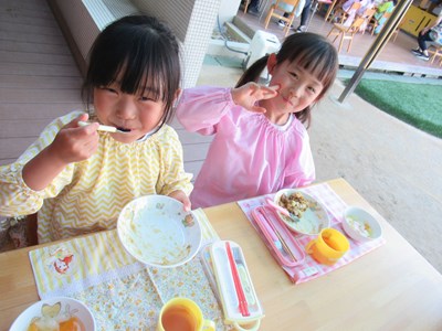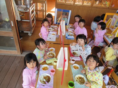 「めっちゃおいしい!!」とすごい食欲のみんな。カレーの上に人参のお花が咲いていたのも、嬉しく食欲をそそります。先生たちと一緒にゆったりと食事を楽しみました。