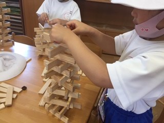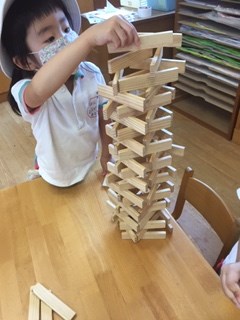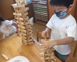 「ぼくも、やりたい!」仲間が増えてきました。ゆっくりゆっくり積み上げて、ときどきお隣さんをちらり。そして、続きを頑張る!