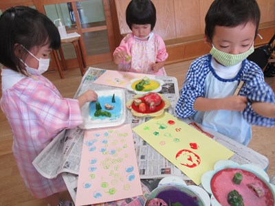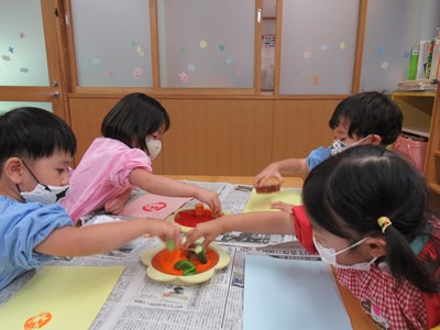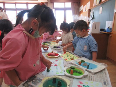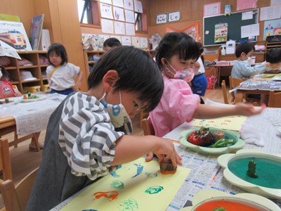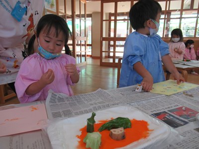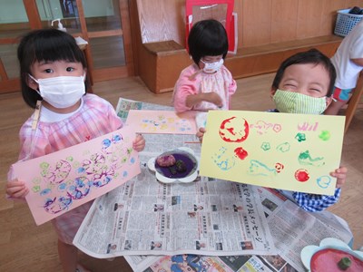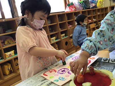 7月19日(月)、ベジタブルスタンプに挑戦した年少組さんの様子をご紹介です。