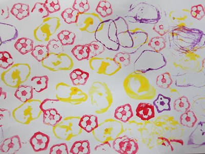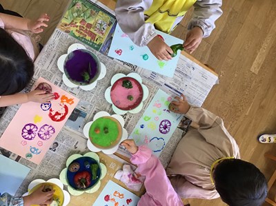 そして、絵の具も色とりどり。さあ、自分で選んだ色の絵の具を付けたベジタブルスタンプを、ペッタン!!