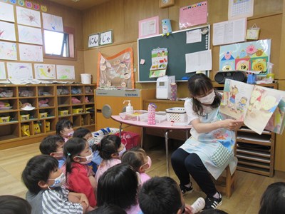 子ども達は、育てているお野菜を実際に見に行ったり、思い浮かべたりしながら、こんな絵本を見ましたよ。