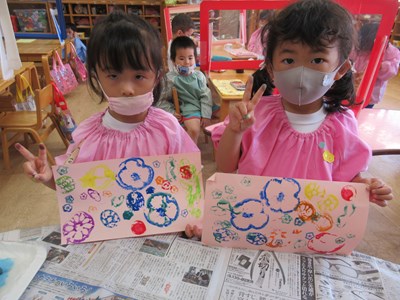 ポンッと力を入れて押してみると、面白い形がついて「先生、みてみて」「すごい!おもしろいね」お花の形や、星のかたちがくっきりとついて、ますます興味津々です。