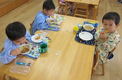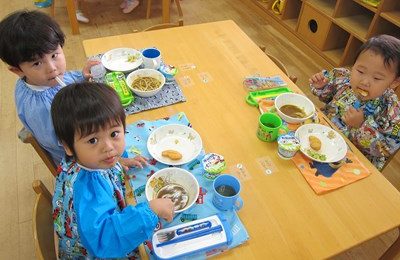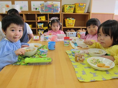 先生から「きちんとお皿を持って食べようね。」と教えてもらったね。「うん、ちゃんと出来てるね!ステキ😊」