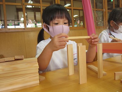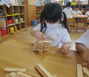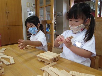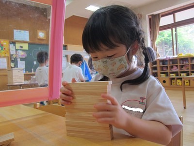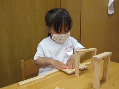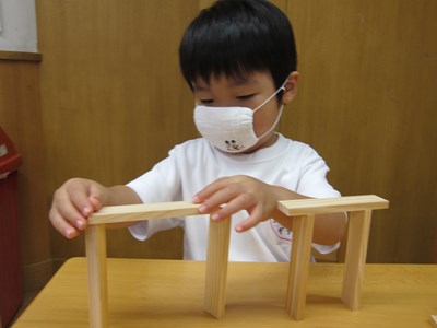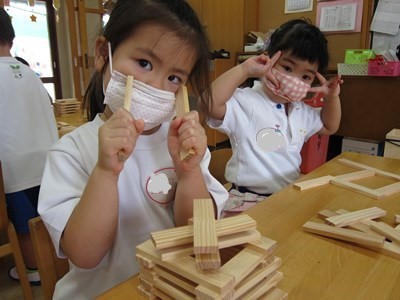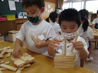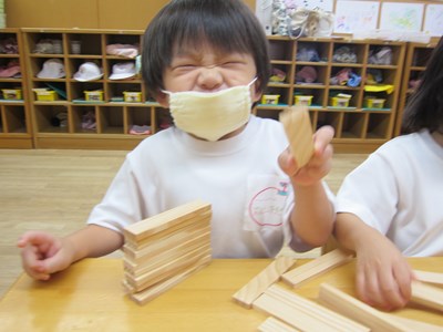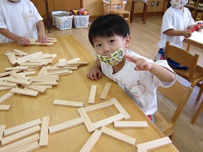 箱の中には同じ形の木片がいっぱい。「みたことある!」・・・そう、年長組さんでは既に大人気の『カプラ』が年少・年中組にもやってきたよ!
