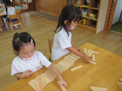 「何を作ろうかな?」すべすべの手触りの木の板を、1枚ずつお友達と一緒に並べてみたよ。もっともっと!どこまで並べていけるかな?