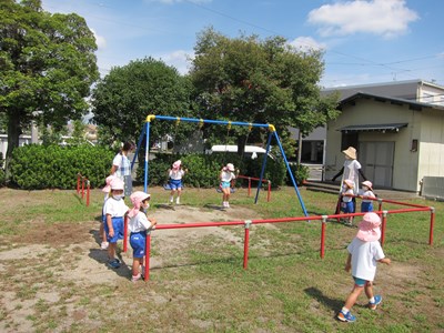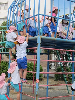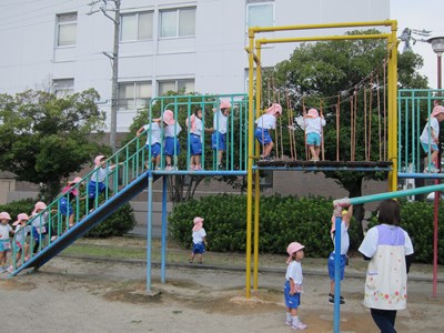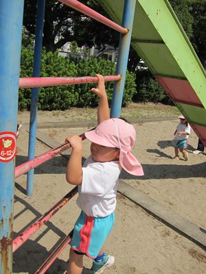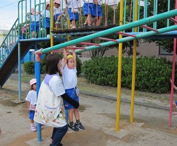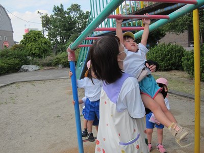 両手で上手に雲梯にぶら下がり、「先生、みていてね!」と一段目、2段目・・・少しずつ進んでいく子もいました。