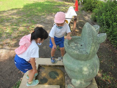 かえるの水飲み場。どこからお水が出てくるんだろう?
