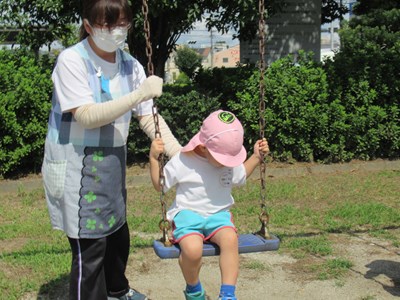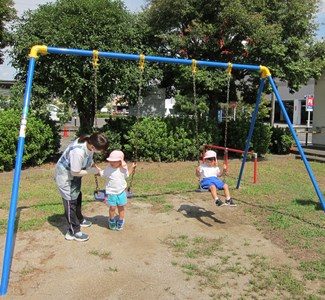 さて、ブランコはどうかな?・・・やっぱりあんまり遊んだことが無い子が多かったようです。でも、先生が側についててくれるので、みんな安心してチャレンジしていましたよ。