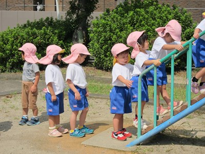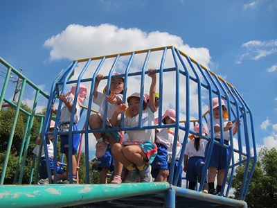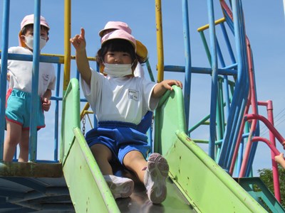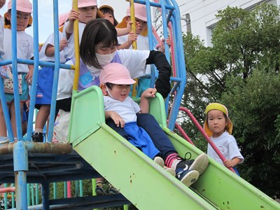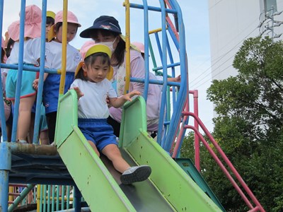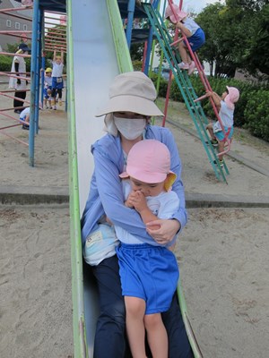 入園当初には、園庭のすべり台が怖くてできなかった子が、9月のこの公園では、自分からすごく積極的に遊具に向かい、先生と一緒にすべり台を楽しむことが出来ました。先生たちも、かわいい子ども達と一緒に滑ることができて、とってもうれしそう😊