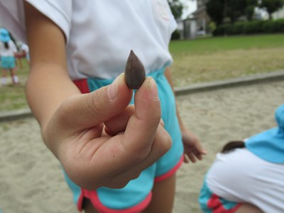 「せんせい、こんな小さなどんぐり見つけたよ!!」頭がやたらと尖ったどんぐり。椎の実かな?幼稚園に戻ったら一緒に調べてみよう😊
