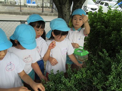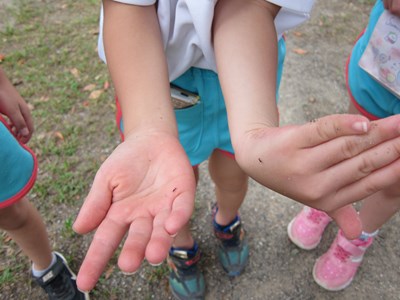 こちらは虫さがし探検隊!!小さな小さな木の実を見つけて「ちっちゃいリンゴみたい!」
