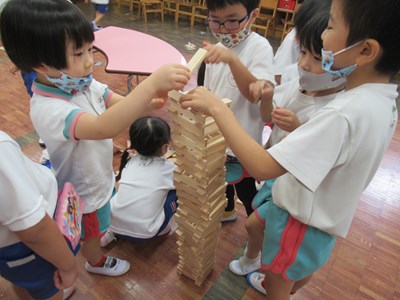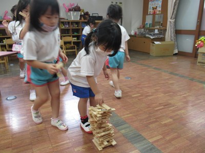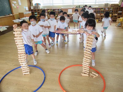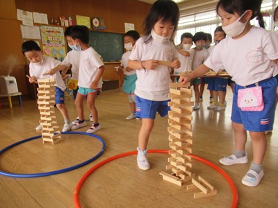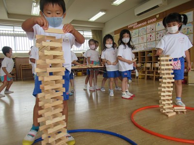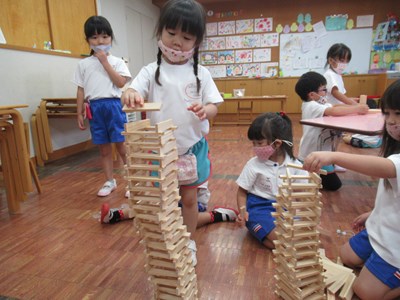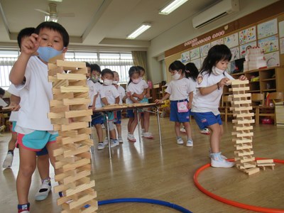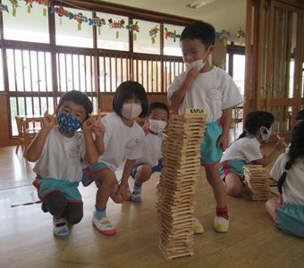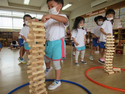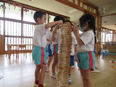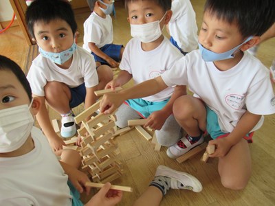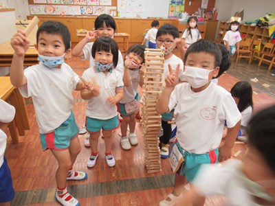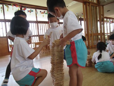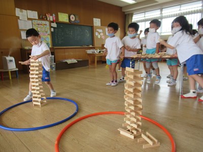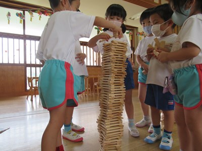 もっともっと高くするには、「順番に・同じ向きで・バランスをみながら」積んでいくと壊れないで高くしていけることが分かってきた、きりん組の子ども達。