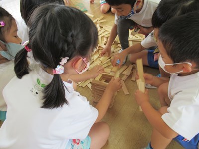 「どんどんのせてみよう!」みんなで一本ずつ、協力して積んでいくよ。倒れないように・・・ね。