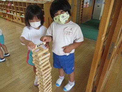 ぱんだ組では、みんなで「どうやって積んだら高く積めるかな?」と考えました。